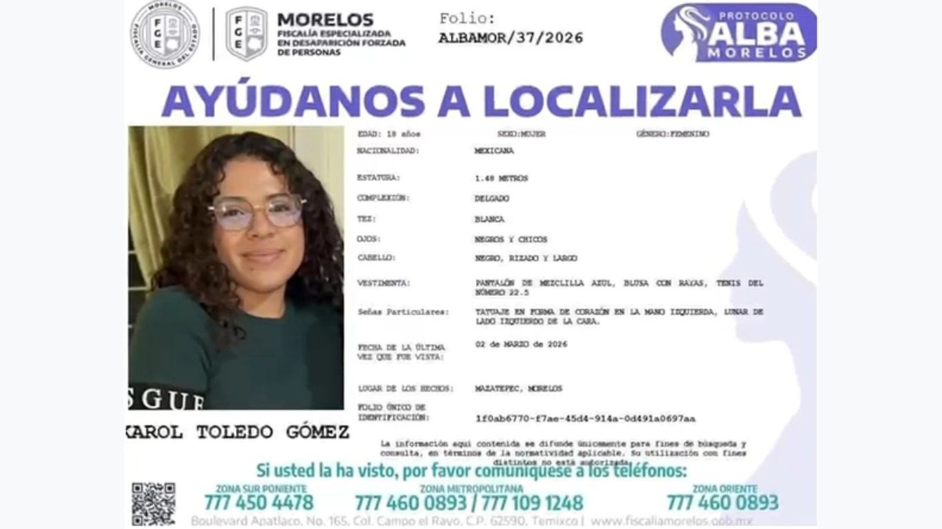 La Fiscalía de Morelos ha solicitado el apoyo de la población para identificar cualquier indicio que lleve al paradero de la estudiante. Se sabe que Karol Toledo Gómez tiene 18 años y, al momento de ser vista por última vez en Mazatepec, vestía su ropa habitual de estudiante. Colectivos feministas han recordado que Morelos mantiene activa la Alerta de Violencia de Género (AVG), por lo que los protocolos de búsqueda deberían ejecutarse con perspectiva de género y máxima celeridad.